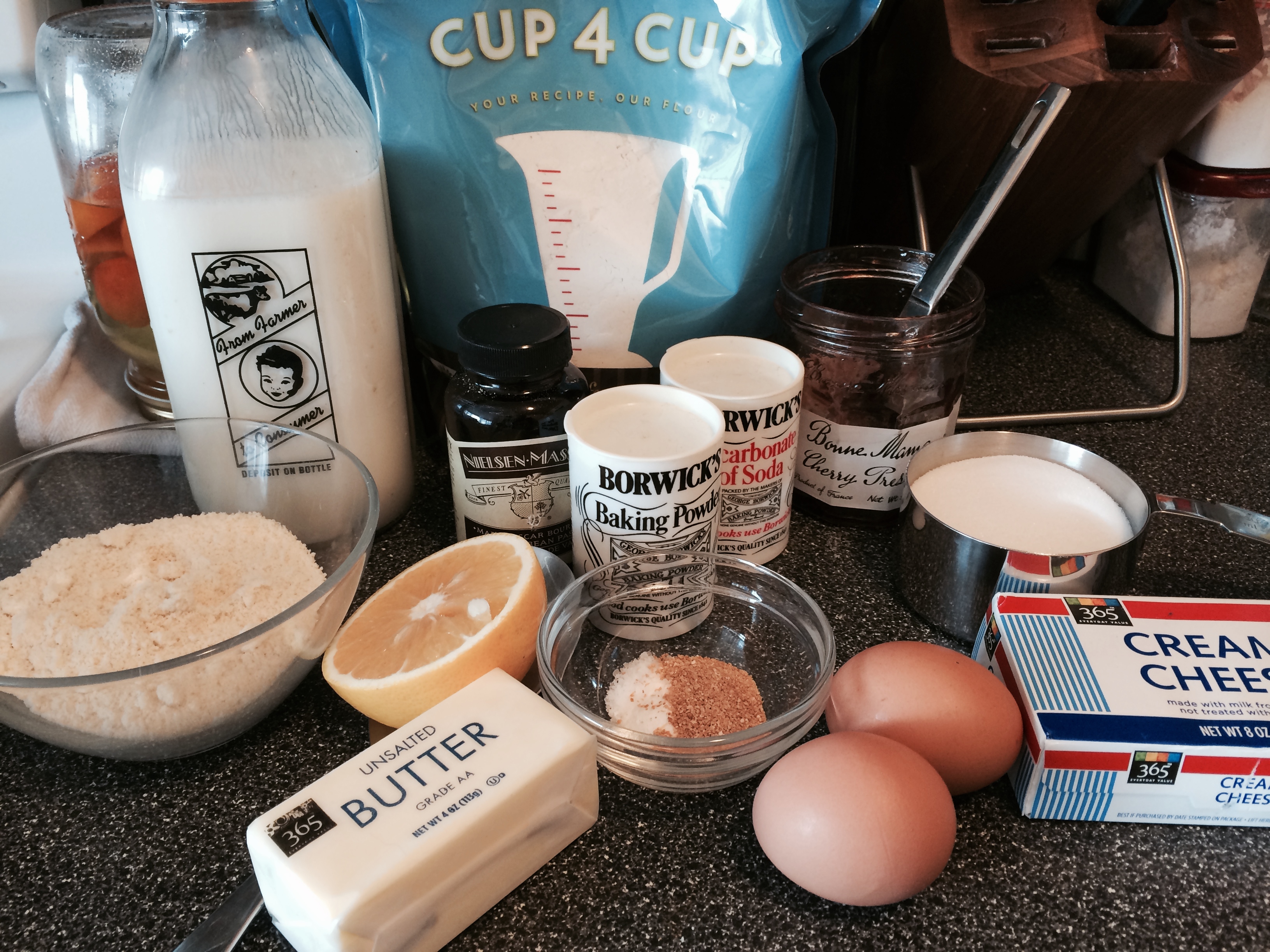 i was racking my brain and then the interwebs for some new toppings for a buttermilk coffeecake base. in the past, i have always topped coffee cake very simply with some streusel crumb, but i came across a blueberry coffee cake with a cream cheese center. still wanting a sort of simple cake and one that wasn’t too wet or too sweet, i started to fiddle with combining the two recipes. cherries are my all-time favorite fruit and i figured cherry preserves would be less wet and sweet than a pie style cornstarch thickened filling. i still wanted my streusel topping, but with some extra punch, so i added almond flour to the mix. My dear friend Brenda calls this the SuperNova Cake.