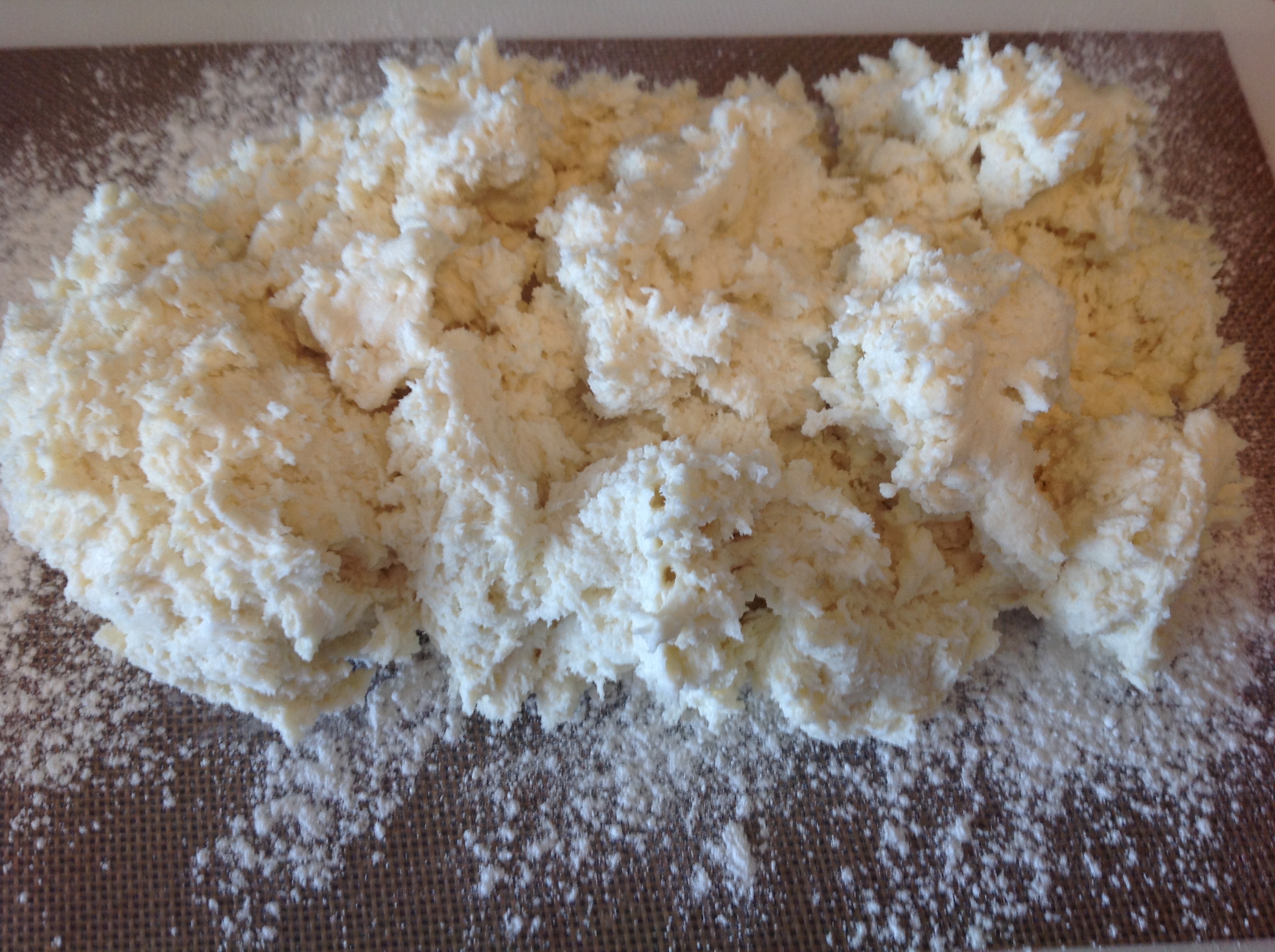 Pour in the buttermilk. Pulse until dough just comes together but does not form solid mass otherwise biscuits may not rise as well. Turn dough out onto lightly floured surface (I use a silpat). Gently pat out dough until it’s 1-inch thick.