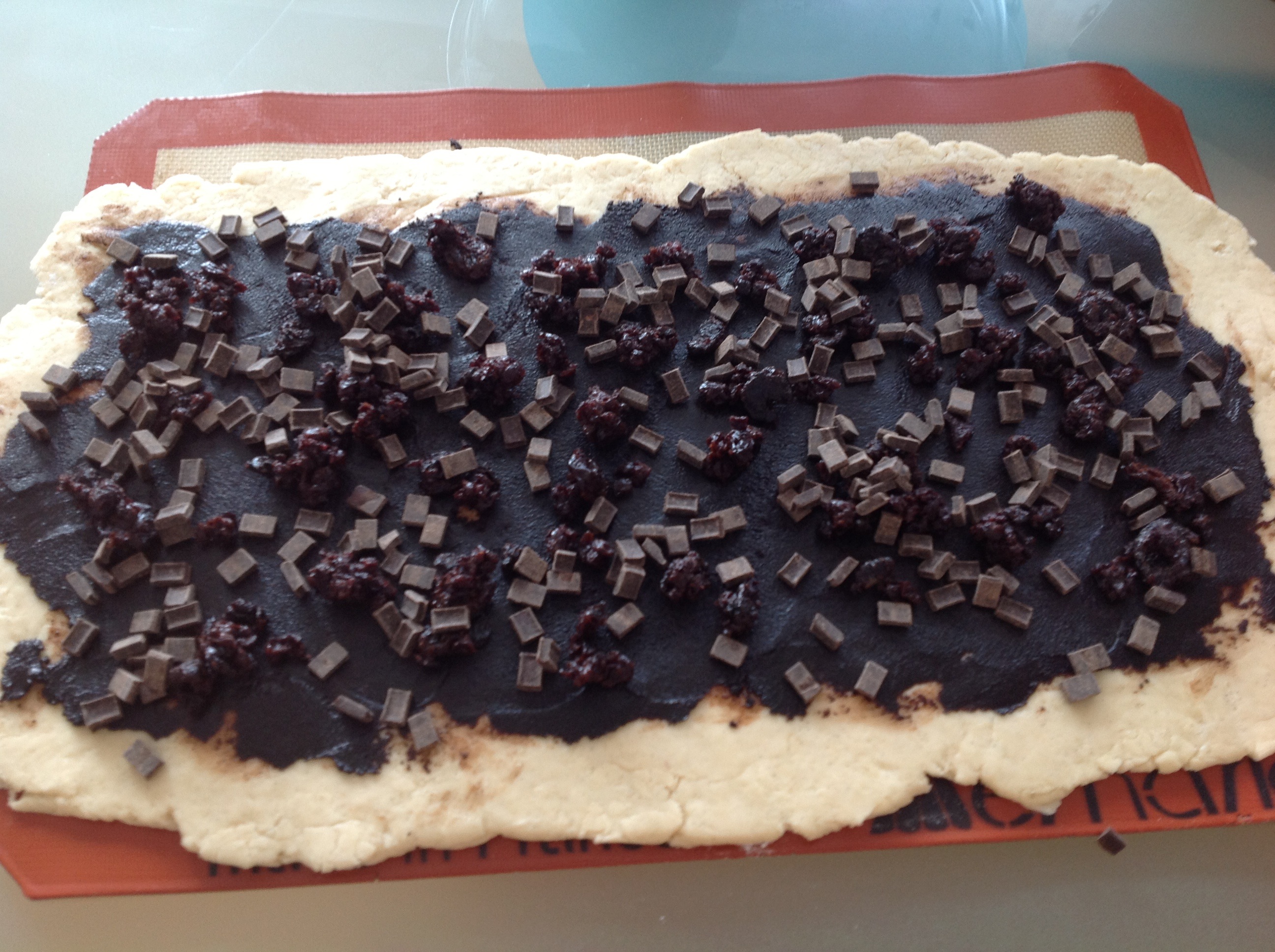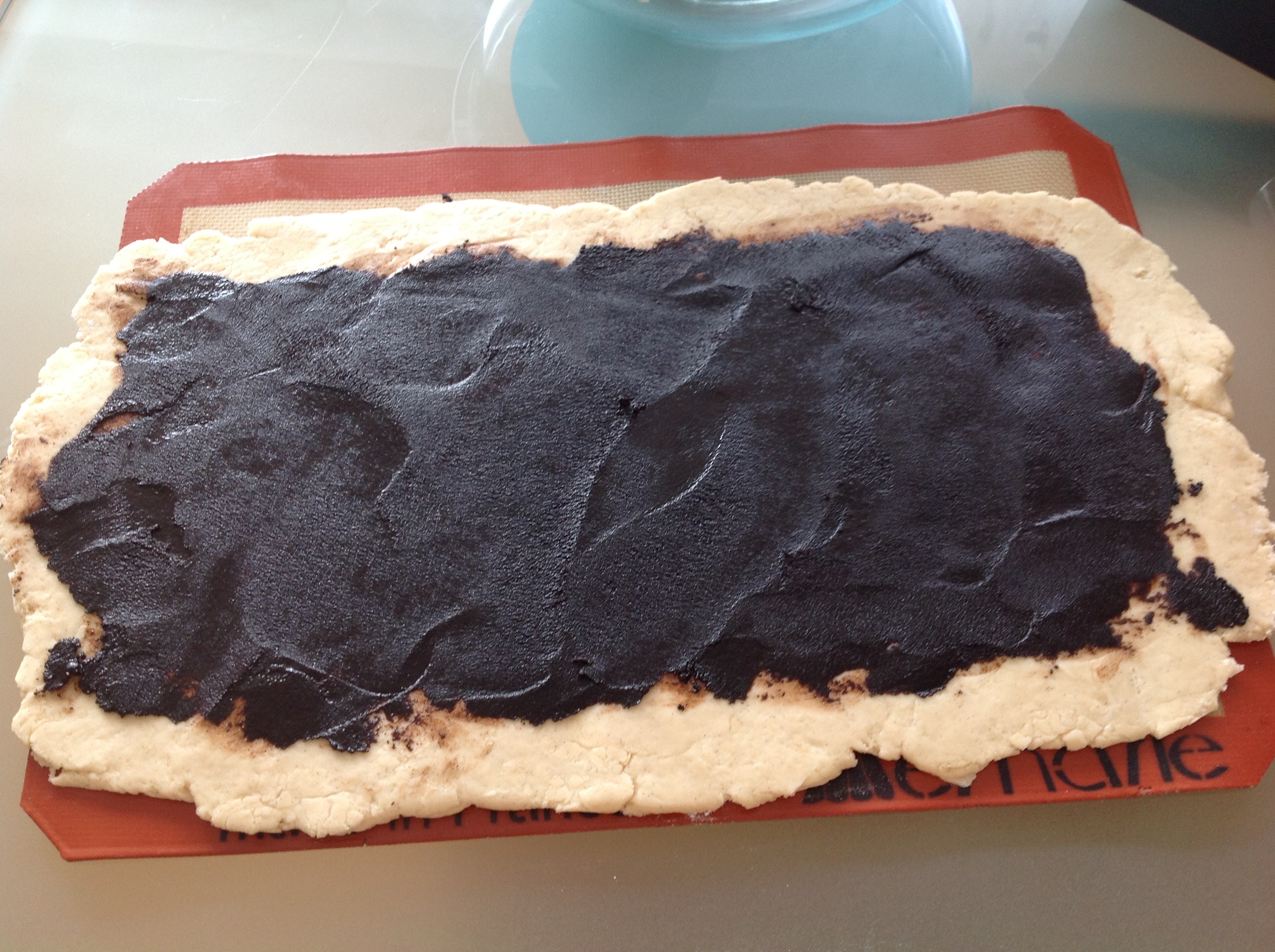 6) Smear each rectangle of the dough with half the filling, coming to within an inch of the edges.