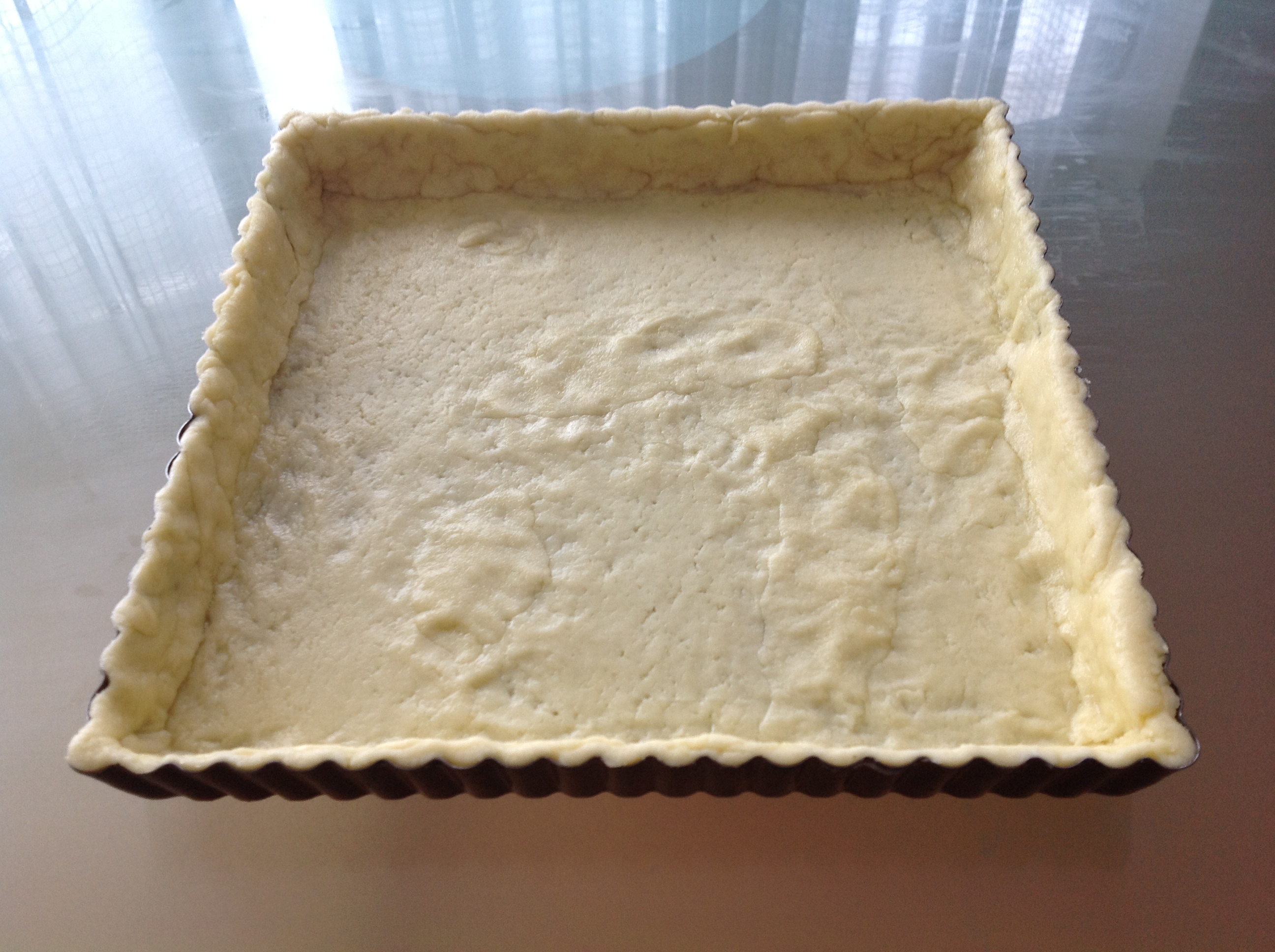 - On a lightly floured surface roll out pastry to fit a tart pan. (I use a 9-inch round or square tart pan with a removable fluted rim and roll the dough to about 1/8 inch thickness.) Roll a rolling pin over the top of the pan to trim the pastry flush with top of rim. Very lightly prick holes in the bottom of shell and the spread filling evenly in the prepared shell. Set aside.