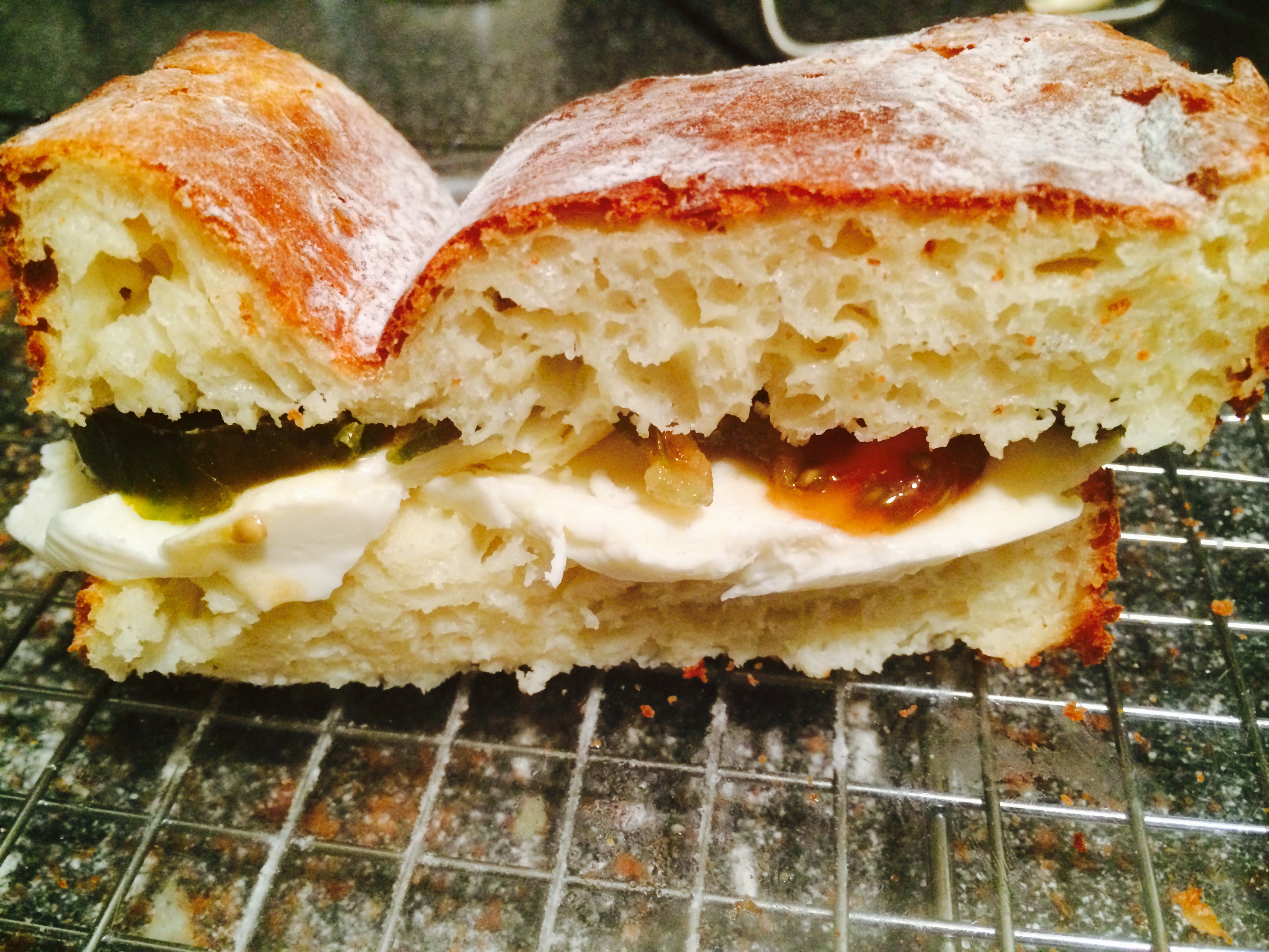 In future, I may use parchment or I may add a little more flour to the dough and try to free form the loaf on a sheet pan on silpat and hope to preserve the rise and airiness. After all my hard work, I treated myself to a lovely fresh mozzarella & brown tomato sandwich. it was simple perfection.