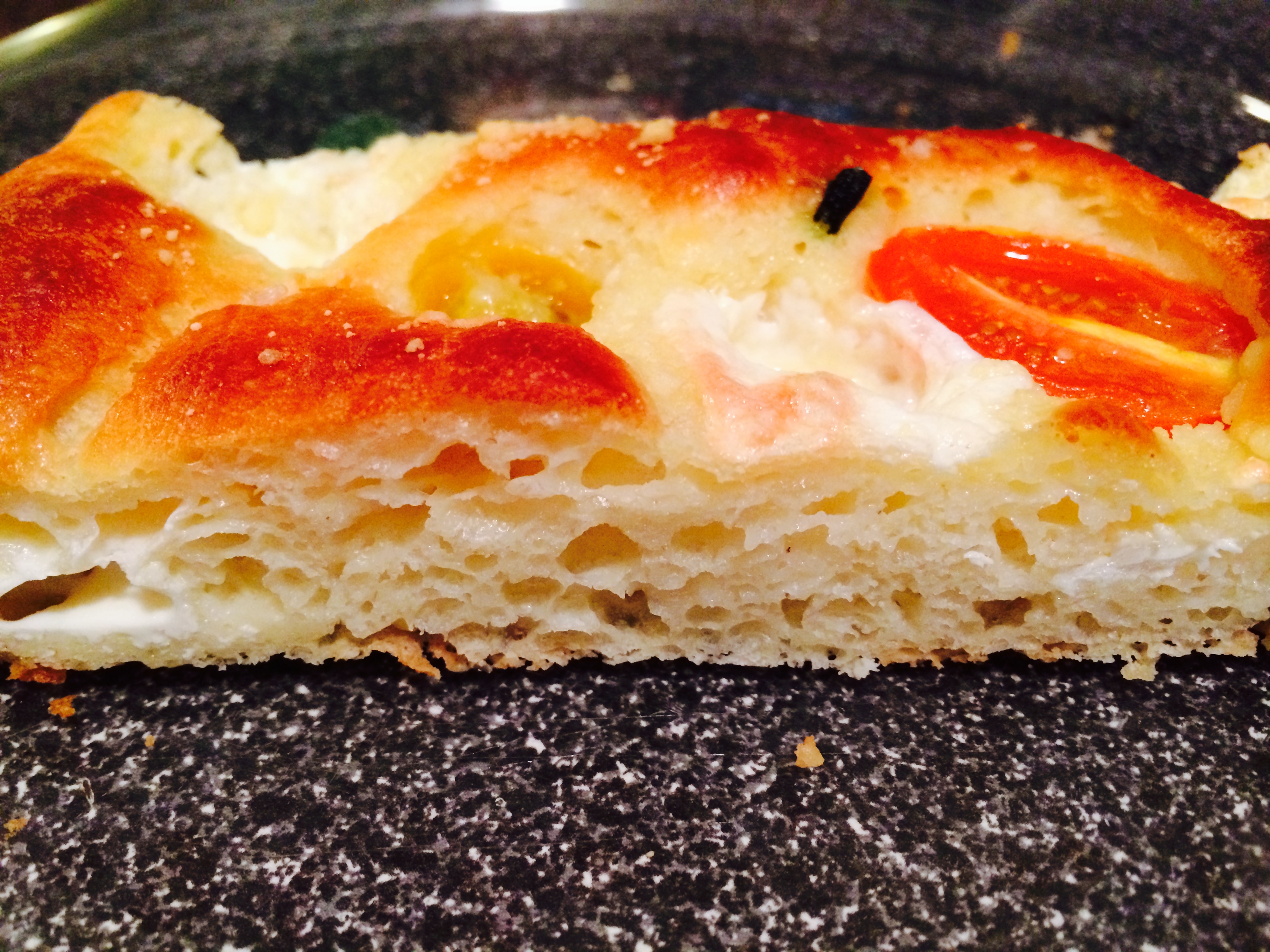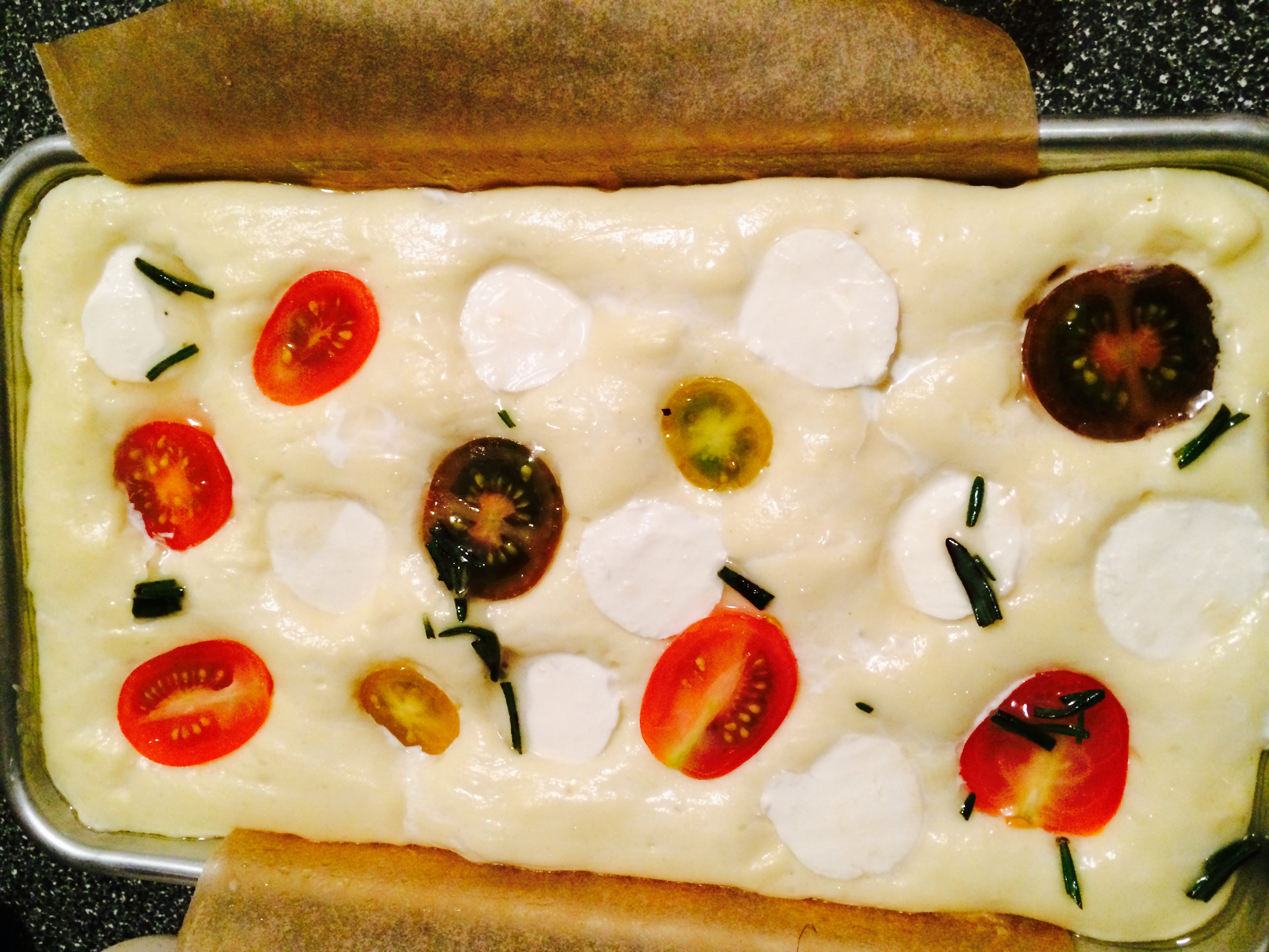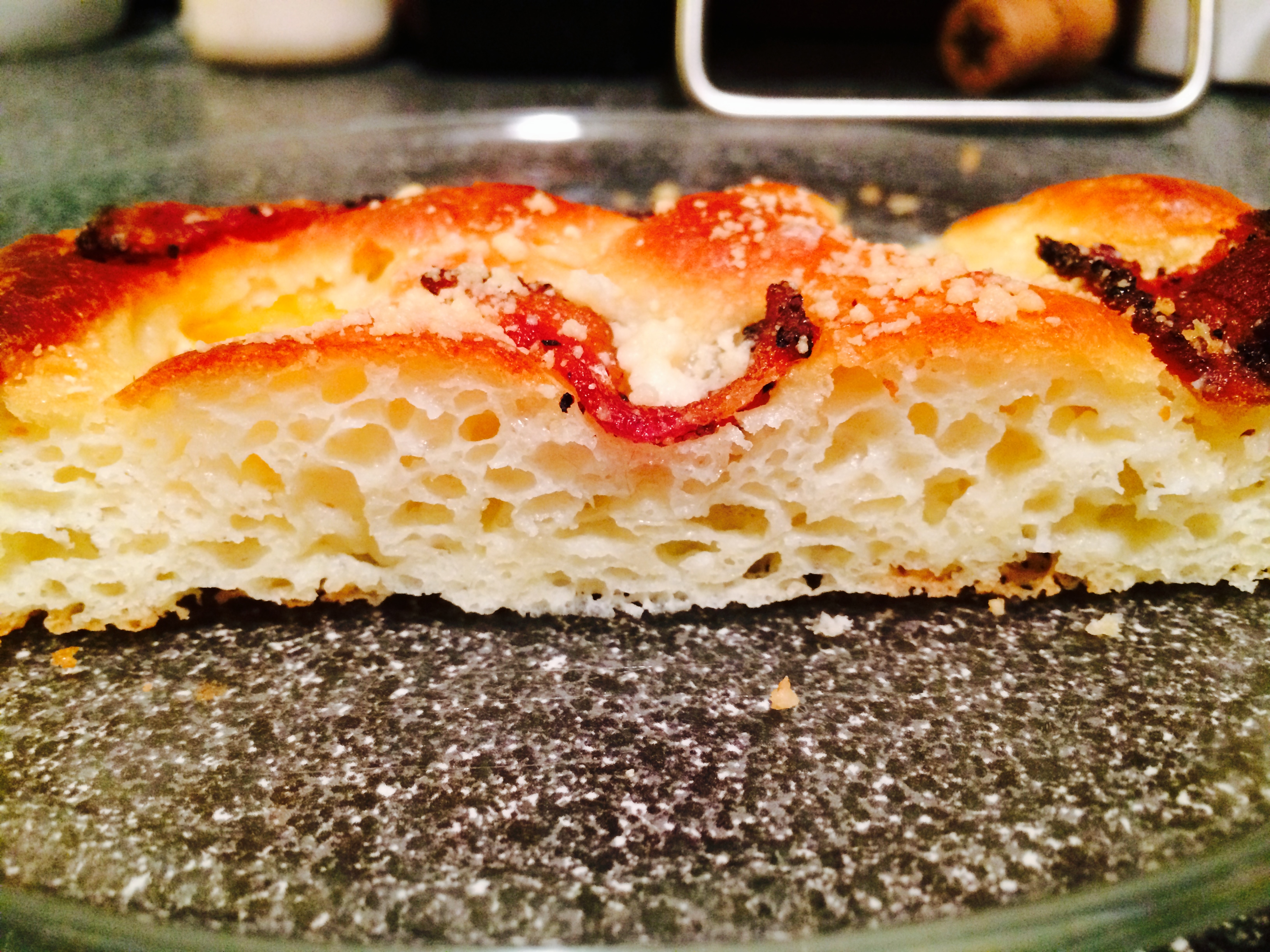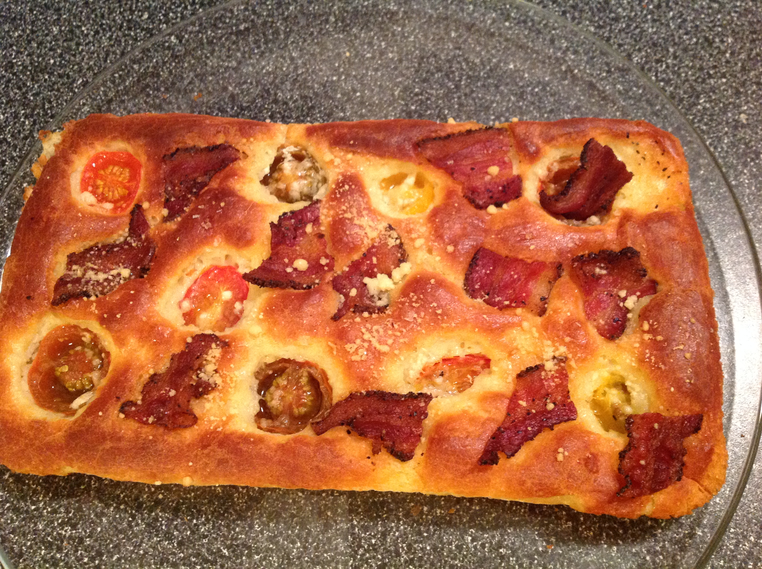 I made two types of focaccia, the first was topped with heirloom cherry tomatoes, pepper bacon, pecorino romano, rosemary infused bacon fat