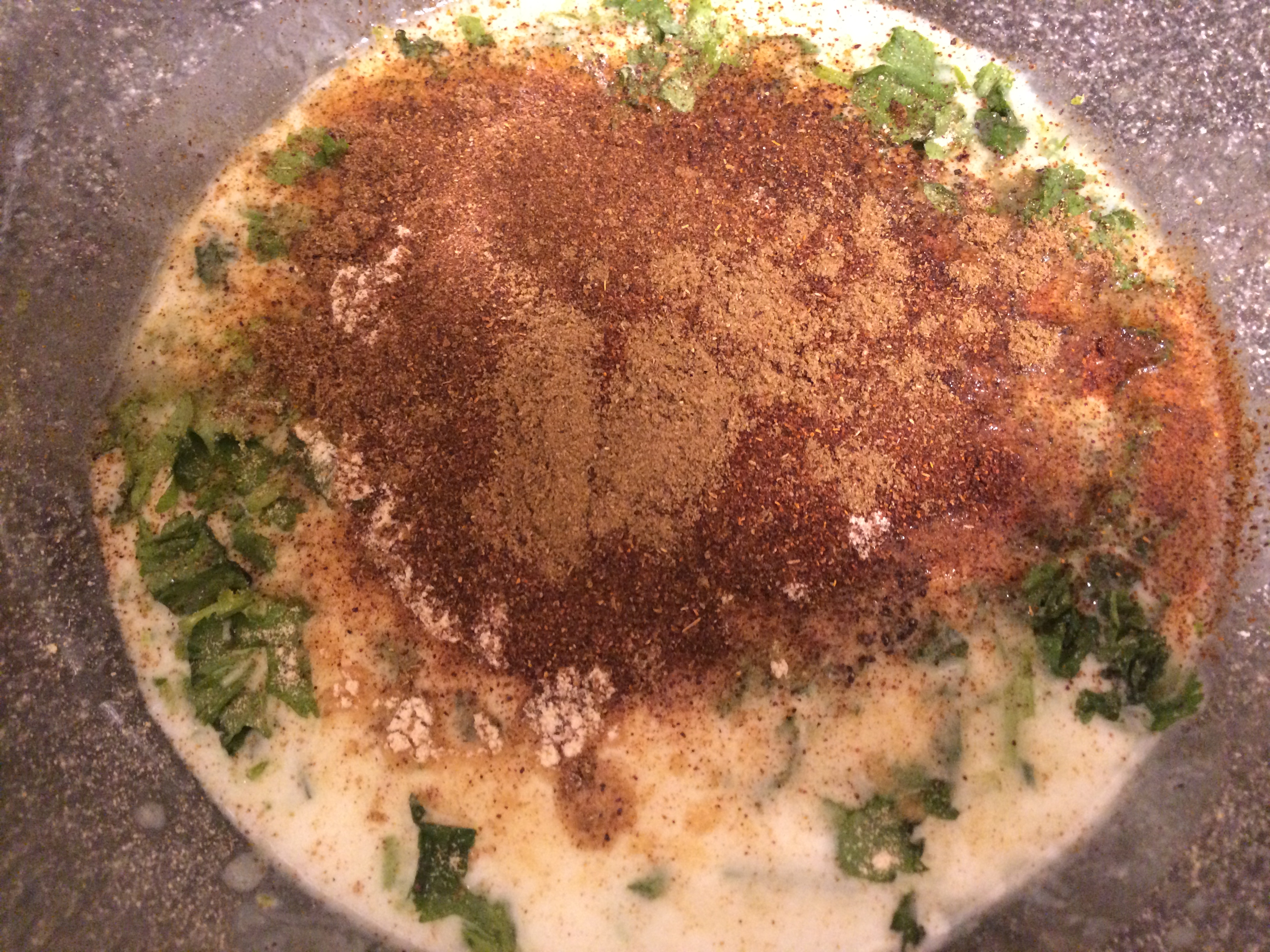 - In a medium bowl, combine the buttermilk with the olive oil, lime juice, lime zest, cilantro, chili powder, cumin, garlic powder, masala mix, salt and pepper.