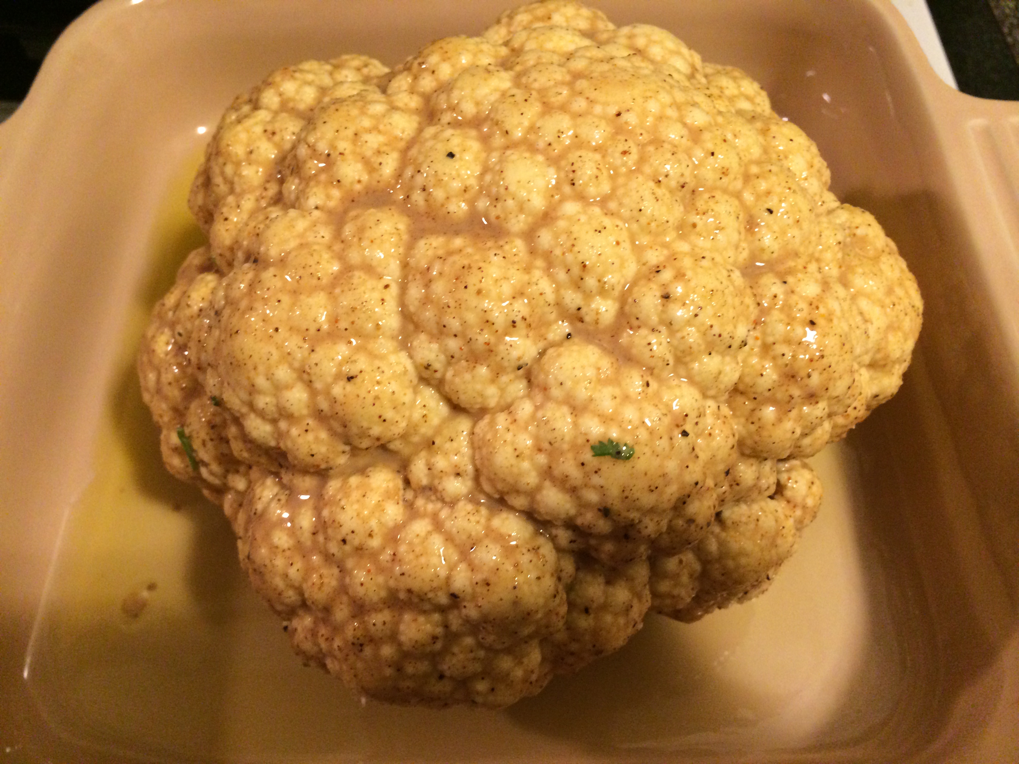 If you’re nervous about the whole head of cauliflower cooking all the way through you can steam it for 5 minutes in the microwave before roasting.