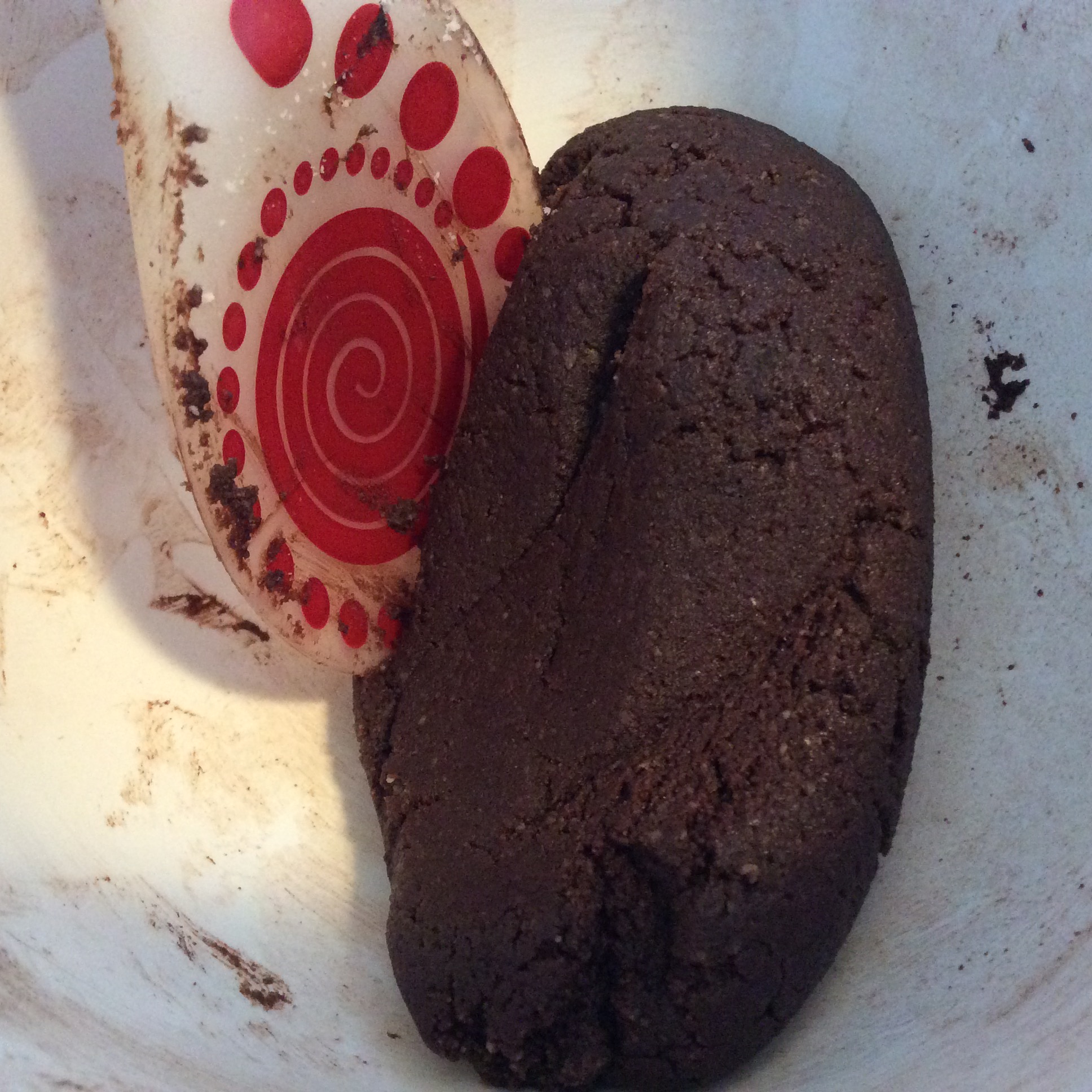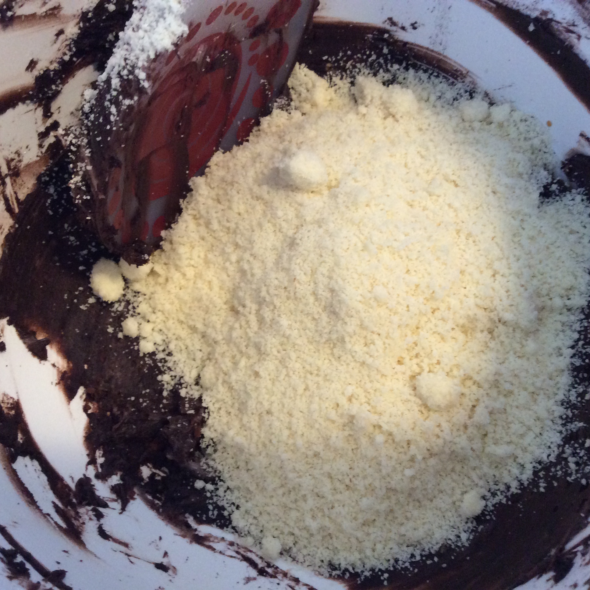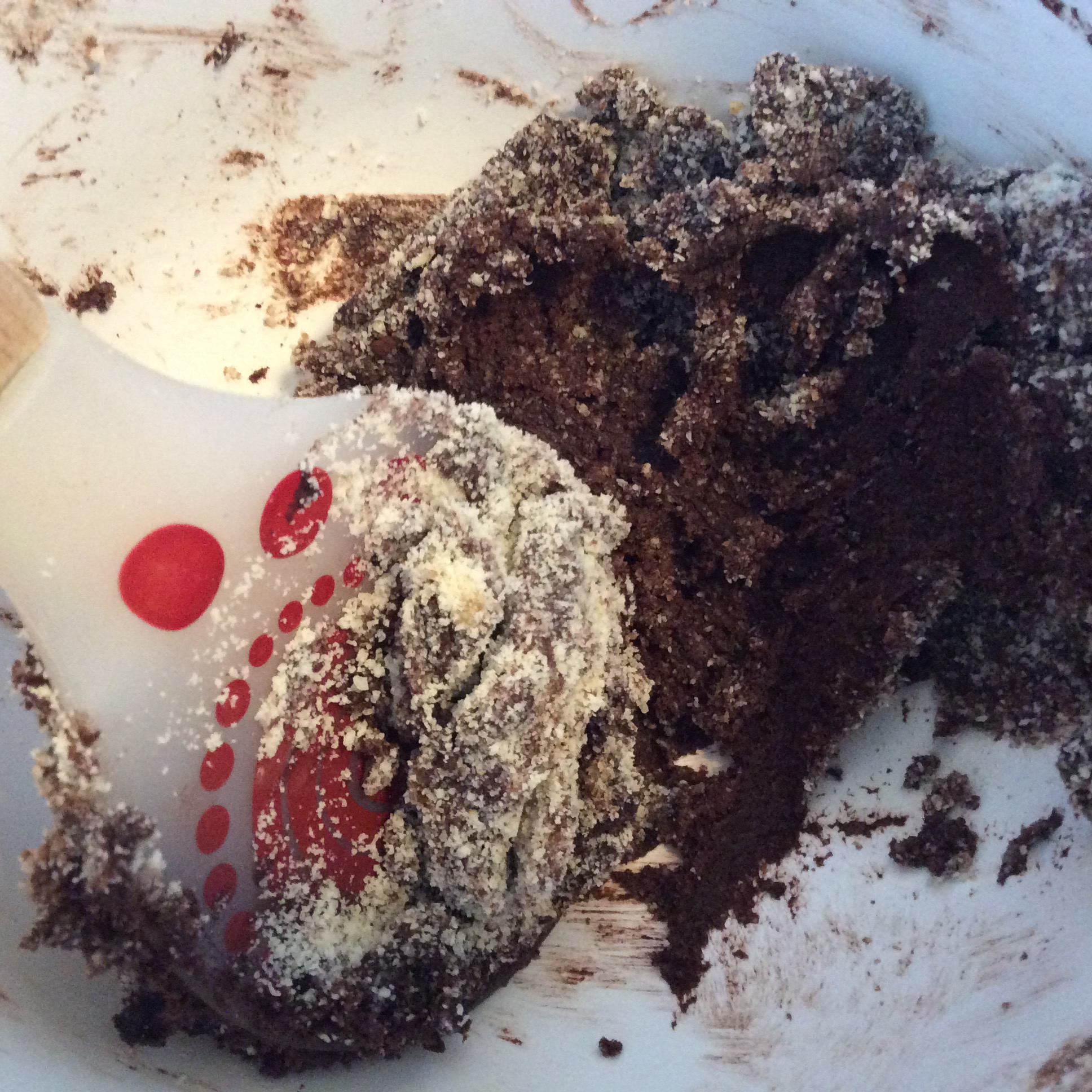 2) Cream butter and confectioner’s sugar together in a small bowl. Add salt, espresso powder, cocoa and vanilla to the creamed butter and sugar, stir until combined. Add vanilla and almond flour to the butter mixture in 2 parts, folding in the almond flour, until a cohesive dough forms.