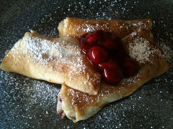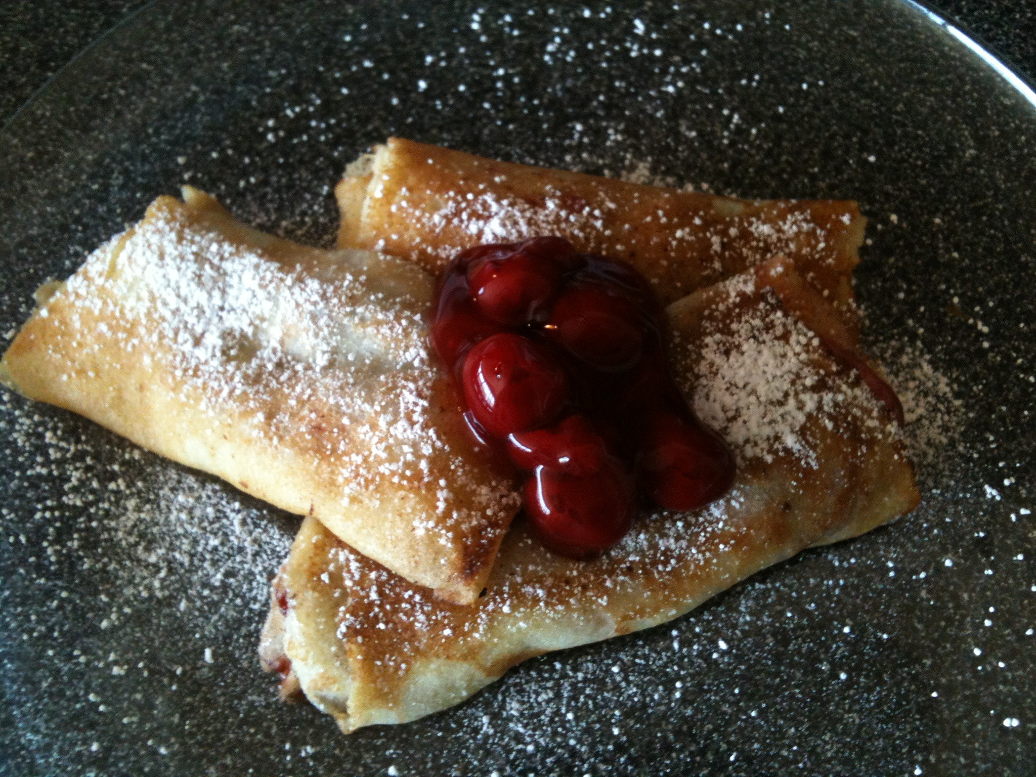 breakfast today is cherry blintzes made from the crêpes i had leftover from the assembly of the mille crêpes cake. i simply took the leftover crêpes and stored them flat in a gallon ziplock type bag in the freezer. i’ve found that they keep for at least two weeks in the freezer. it was early, so i used cherry pie filling as my filling. you could use pretty much any type of pie filling, jam or preserves, you like. feel free to add some farmer or cottage cheese to the blintz as well. Assembly and prep are pretty simple. on a cutting board lay out a crêpe, pretty side down and drop about a tablespoon full of your fruit or cheese filling just below the center of the crêpe and fold like an envelope. i griddle the blintzes on a hot buttered cast iron comal, flap side down first then turn. you’re cooking them just to crisp and heat through. sprinkle with confectioner’s sugar, whipped cream or sour cream. enjoy!